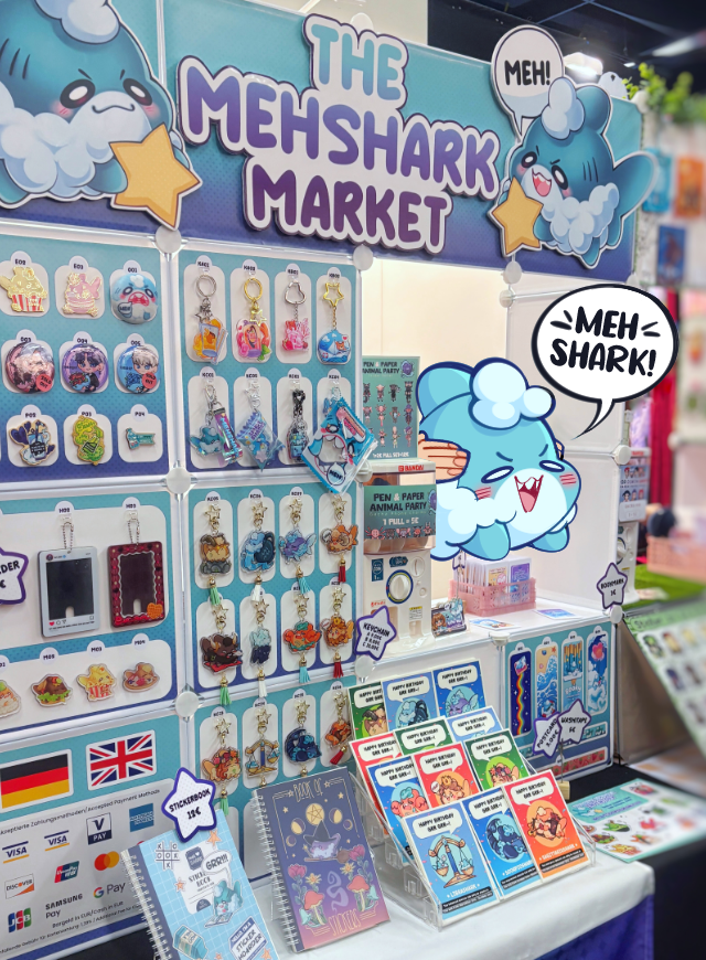 Graduating with a bachelor’s degree in game design at MDH in 2020, I became part of the games industry for some time before eventually, rediscovering my passion for designing merch! Today, you can find me and my dearest mascot companion Mehshark at local conventions like Dokomi or Gamescom – and right here ♡